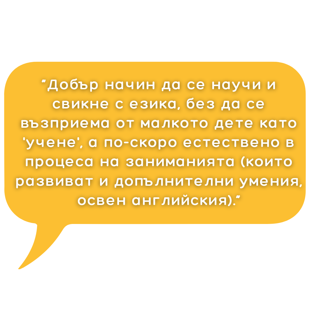 Малките деца усвояват нови езици по естествен начин. В нашите занимания те развиват правилно произношение и автентичен говор от ранна възраст.